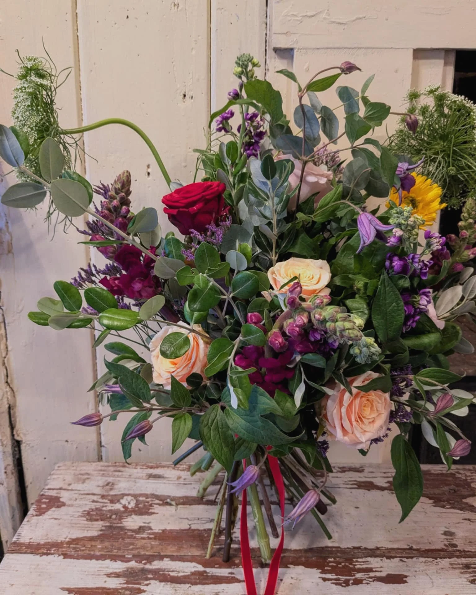 A romantic flower mix of pinks and reds and foliages.
